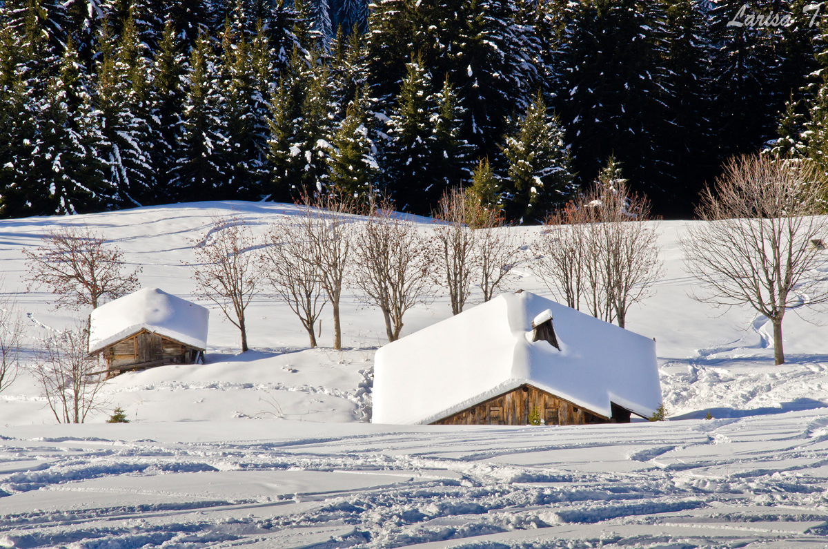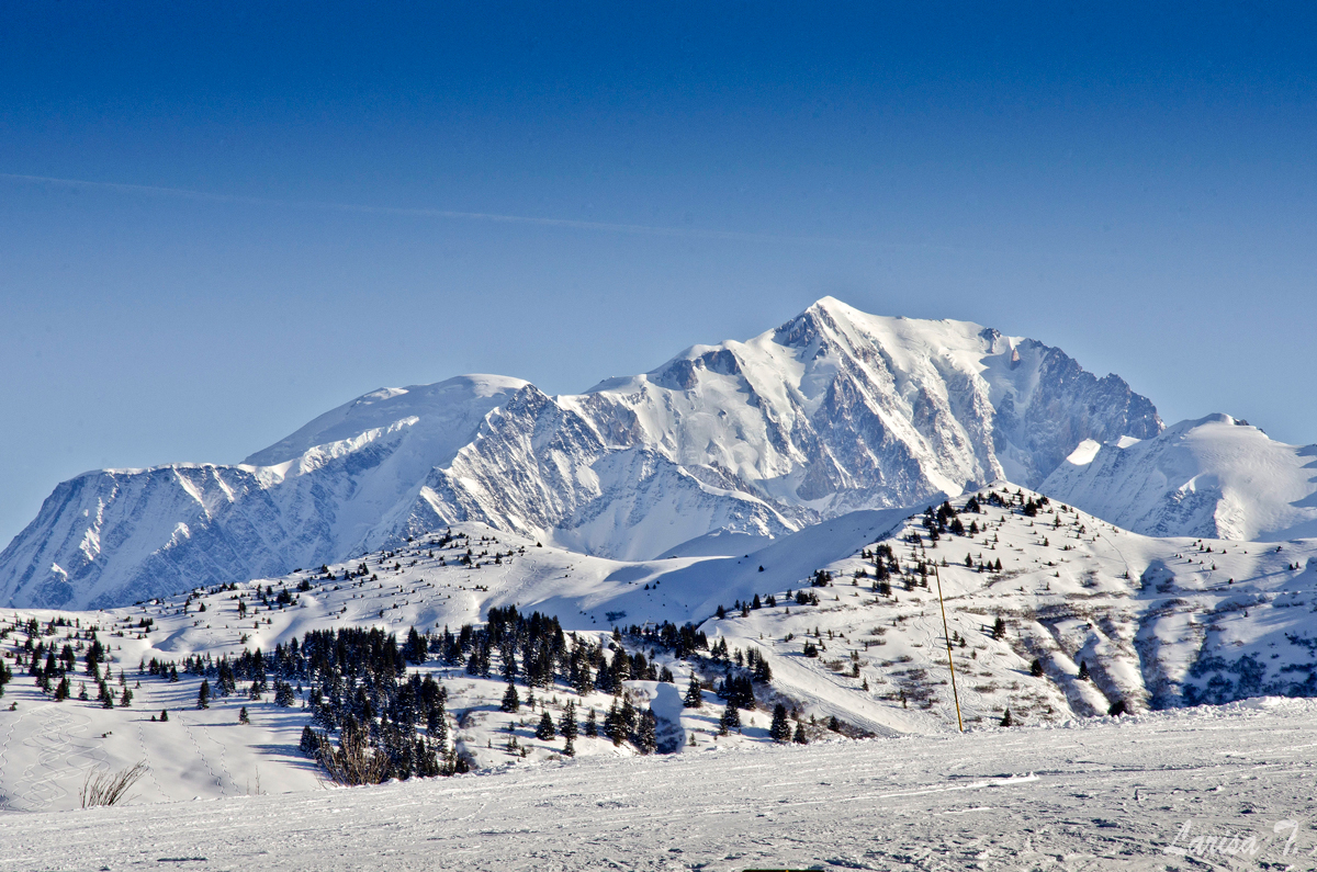 De la stația terminus a telescaunului a urmat o mică urcare până în vârf, unde ne-am oprit pentru vreo juma’ de oră la refugiu, pentru o ciocolată caldă. Ar fi fost și păcat să nu o facem, peisajul din jur era amețitor: cu Mont Blacul în față și Masivul Aravis în spate, zău că aș vrea să încep și să închei fiecare an. Am concluzionat în acel moment că poate n-o fi fost 2013 un an excelent din toate punctele de vedere, dar măcar s-a terminat într-un mare fel. N-am zăbovit prea mult, ne-am pus rachetele în picioare și am început coborârea pe poteca marcată spre Lac du Gui, ca mai apoi să cotim pe chemin du Chapet și să ajungem înapoi în Nôtre Dame de Bellecombe. Era o zi perfectă de iarnă, cu soare și nici un nor pe cer. În plus era atât de cald, că am văzut persoane la plajă. Poate pentru mulți dintre voi pare ciudat, dar în zilele însorite poți sta la plajă în maieu pe munte și nu-i atât de frig precum vă imaginați. În plus, credeți-mă pe cuvânt că bronzul de munte durează muuult mai mult! Am trecut pe lângă o căbănuță din lemn foarte simpatică, un fel de refugiu, unde ne-am oprit pentru câteva minute de liniște…Minunat! Nu-mi venea să mai plec de acolo. Dar a trebuit să ajungem înapoi la civilizație, să nu ne prindă anul nou chiar pe drumuri. Nu de alta, dar n-avem șampania la noi.