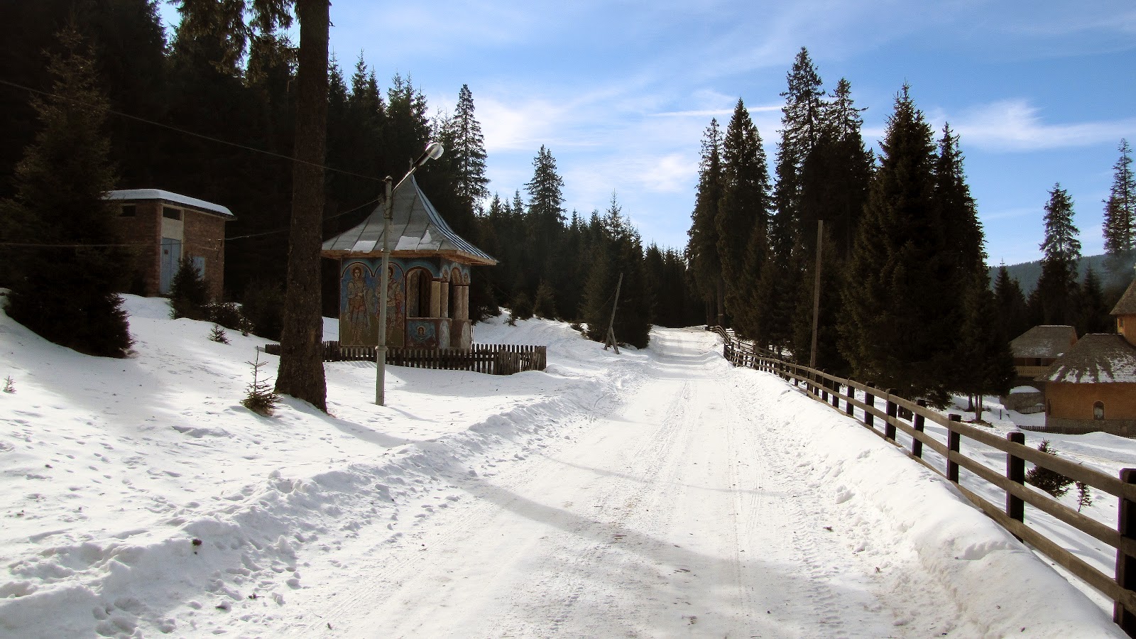 O luăm la dreapta spre Mănăstirea Peștera. Totul parcă dormitează, nu mișcă nimic. Totul este înghețat și prins parcă într-un tablou cu o imagine de iarnă. Doar fumul ce iese pe coșuri dă viață privelistei. Coborâm treptele de piatră prin Cheița Cocorei, traversând Ialomița înghețată la ieșirea acesteia din chei. De la capătul opus al podului se ramifică o cărare ce duce spre Grota Peștera Ialomiței, dar nu mai urcăm acolo de data aceasta.