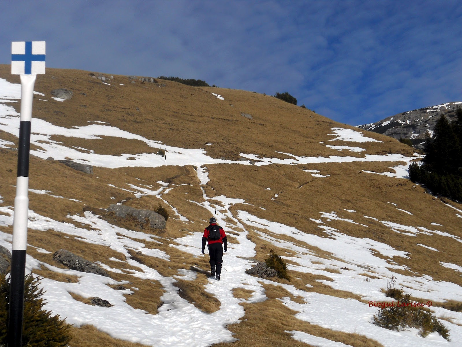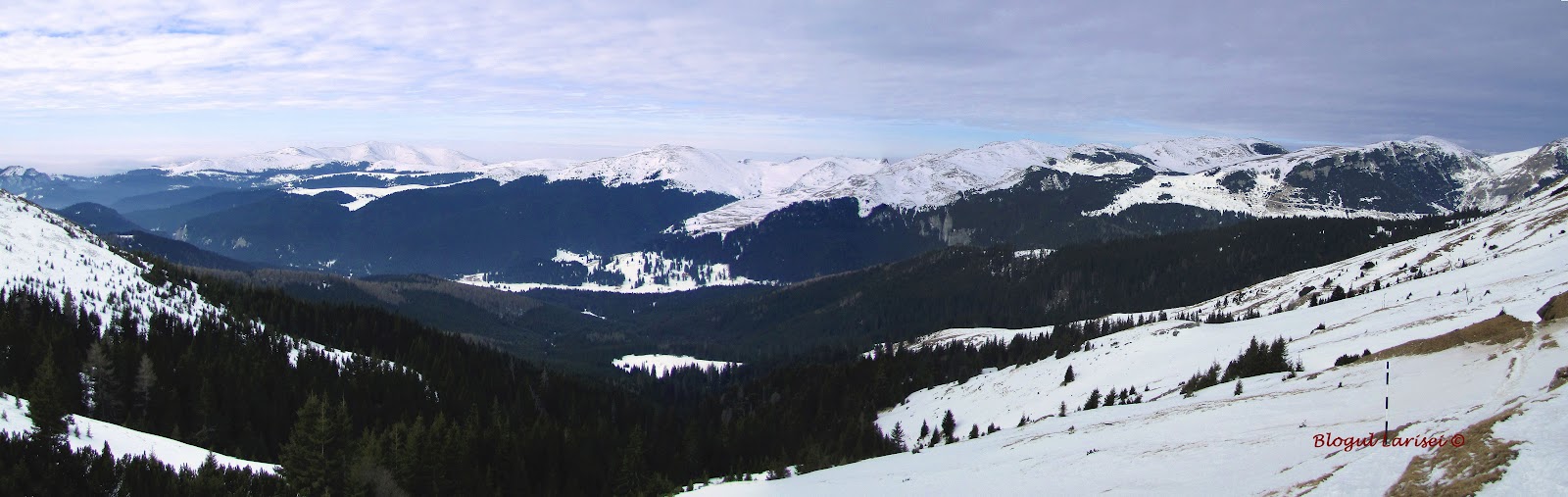 Ziua se apropie de sfârșit. Soarele începe să coboare spre apus, ascunzându-se după vârfuri. Liniștea se lasă și mai apăsătoare și grea peste munte, iar oboseala pune stăpânire din ce în ce mai mult pe noi. De la Cabana Babele coborâm pe coama lungă a platoului. Muntele tace, amorțit de zăpada înghețată care îl îmbracă ca o haină albă. Mergem repede, urmând stâlpii de marcaj, aproape orizontal.