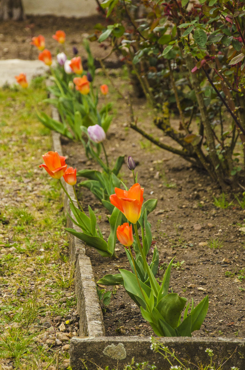 Cât despre lalele, ei bine îmi plac la nebunie! Dar ce flori nu-mi plac pană la urmă? Îmi plac pentru că sunt simple, vesele, colorate, gingașe, unele dintre cele mai populare flori și printre primele vestitoare ale primăverii. În grădină sunt ușor de cultivat și întreținut, sunt perene, rezistente și dau adesea un rezultat remarcabil. Ca să nu mai vorbim despre varietatea lor, o multitudine de soiuri în nuanțe și forme deosebite. Din păcate eu nu prea stau bine în grădină nici la capitolul lalele. N-am găsit multe nici când m-am mutat aici, n-am nici acum, recunosc nu m-am obosit prea tare să plantez astă-toamnă. Am cumpărat vreo trei pungi de bulbi în culori diferite (portocaliu, alb-mov și mov, chiar dacă ofertă era mult mai variată în magazin. În curte aveam deja dintre cele roșii, galbene și diverse combinații între cele două, astfel că la momentul respectiv am considerat că-ar fi suficiente. Desigur că nu sunt suficiente, lalelele sunt faine în covor, multe la grămadă, nu răsfirate pe te miri unde. Asta este, anul viitor o să știu mai bine.