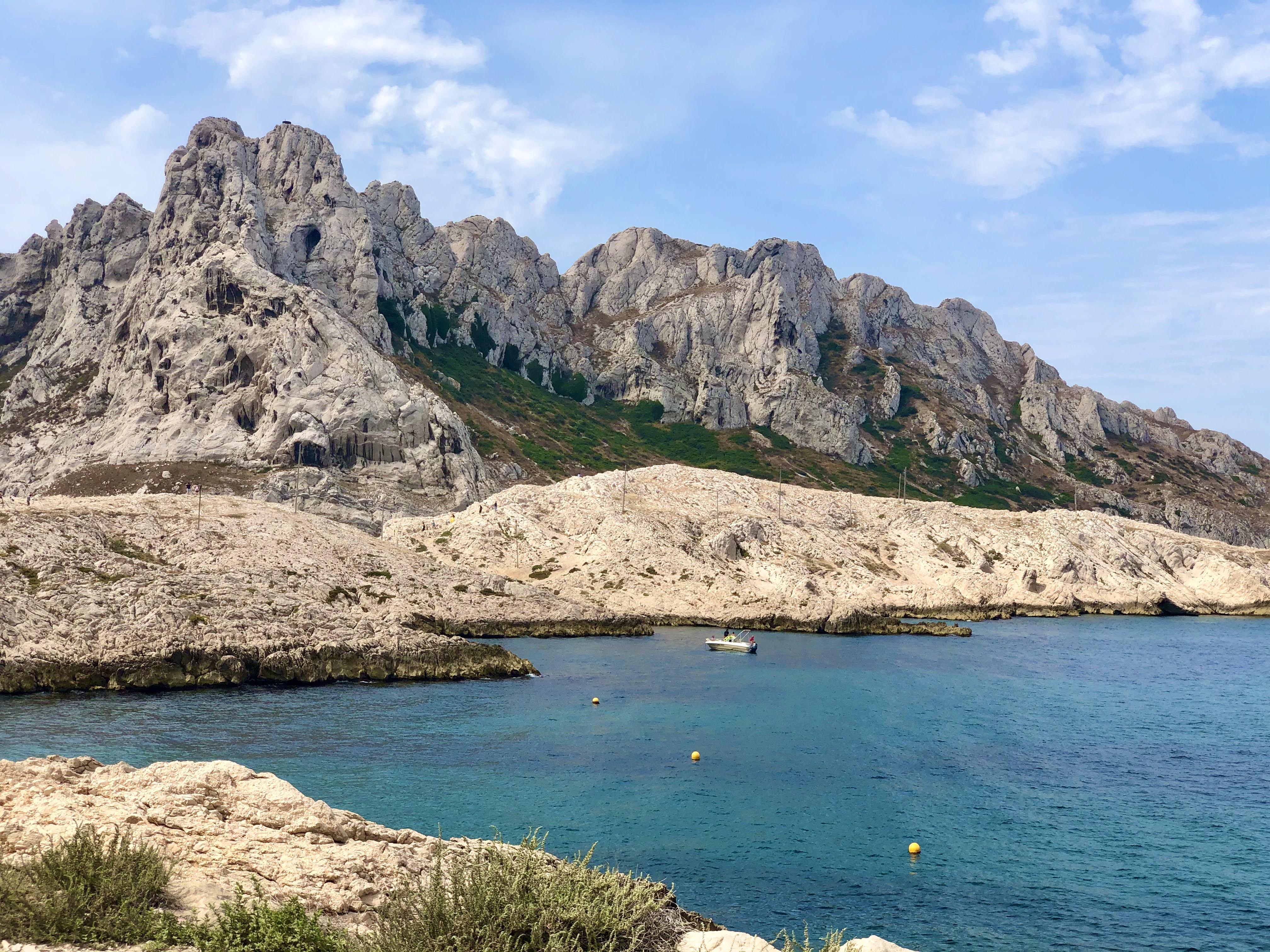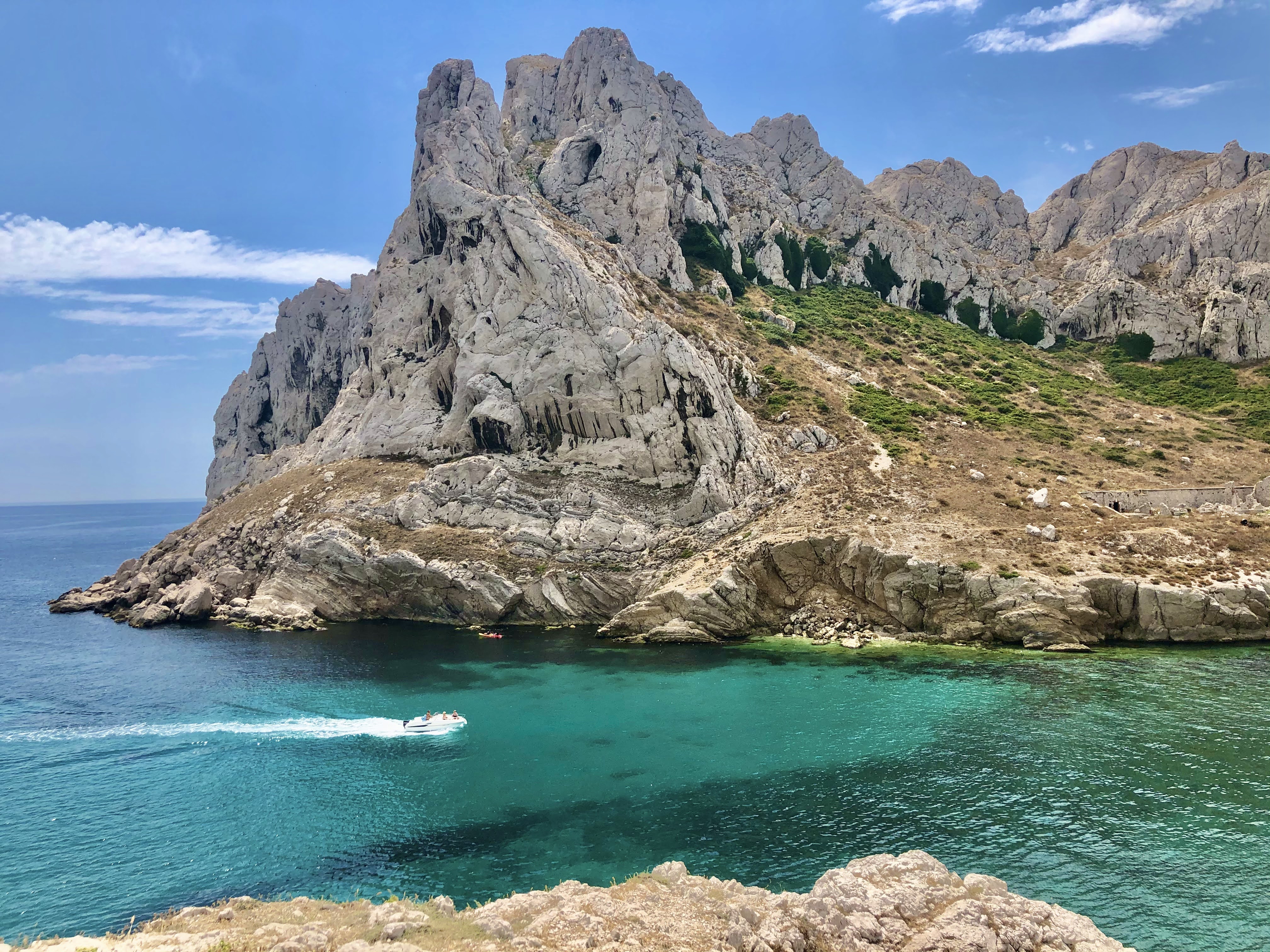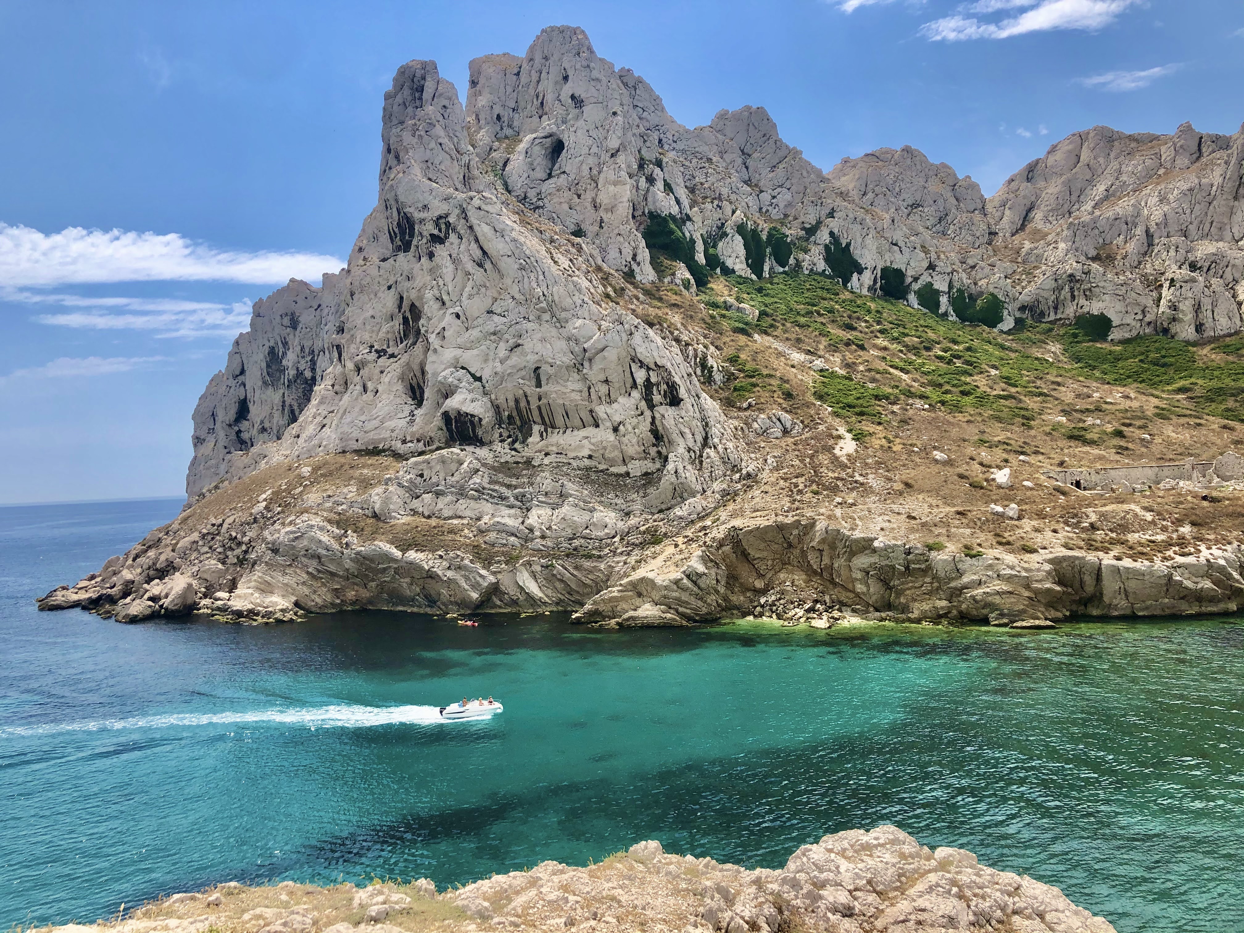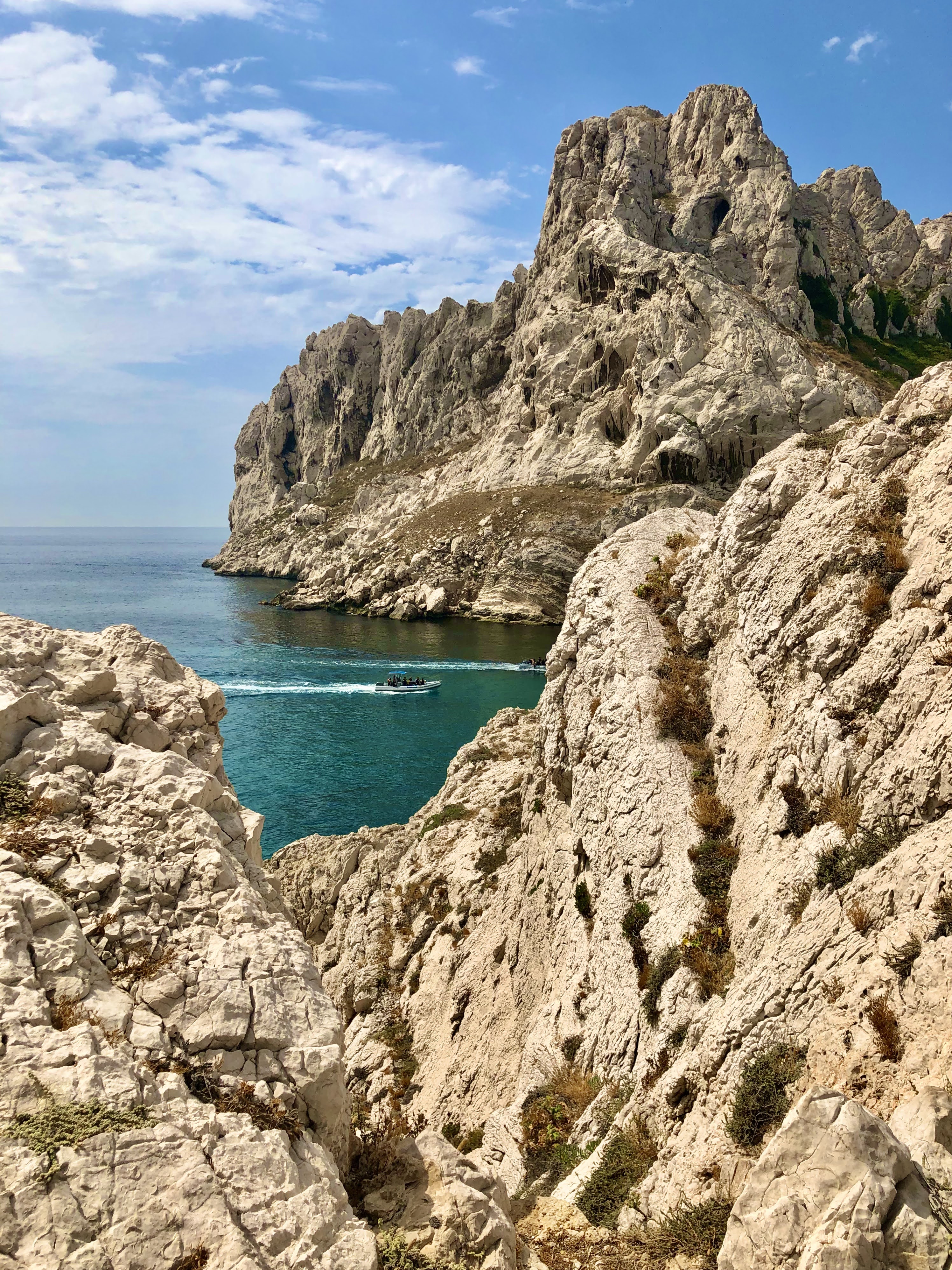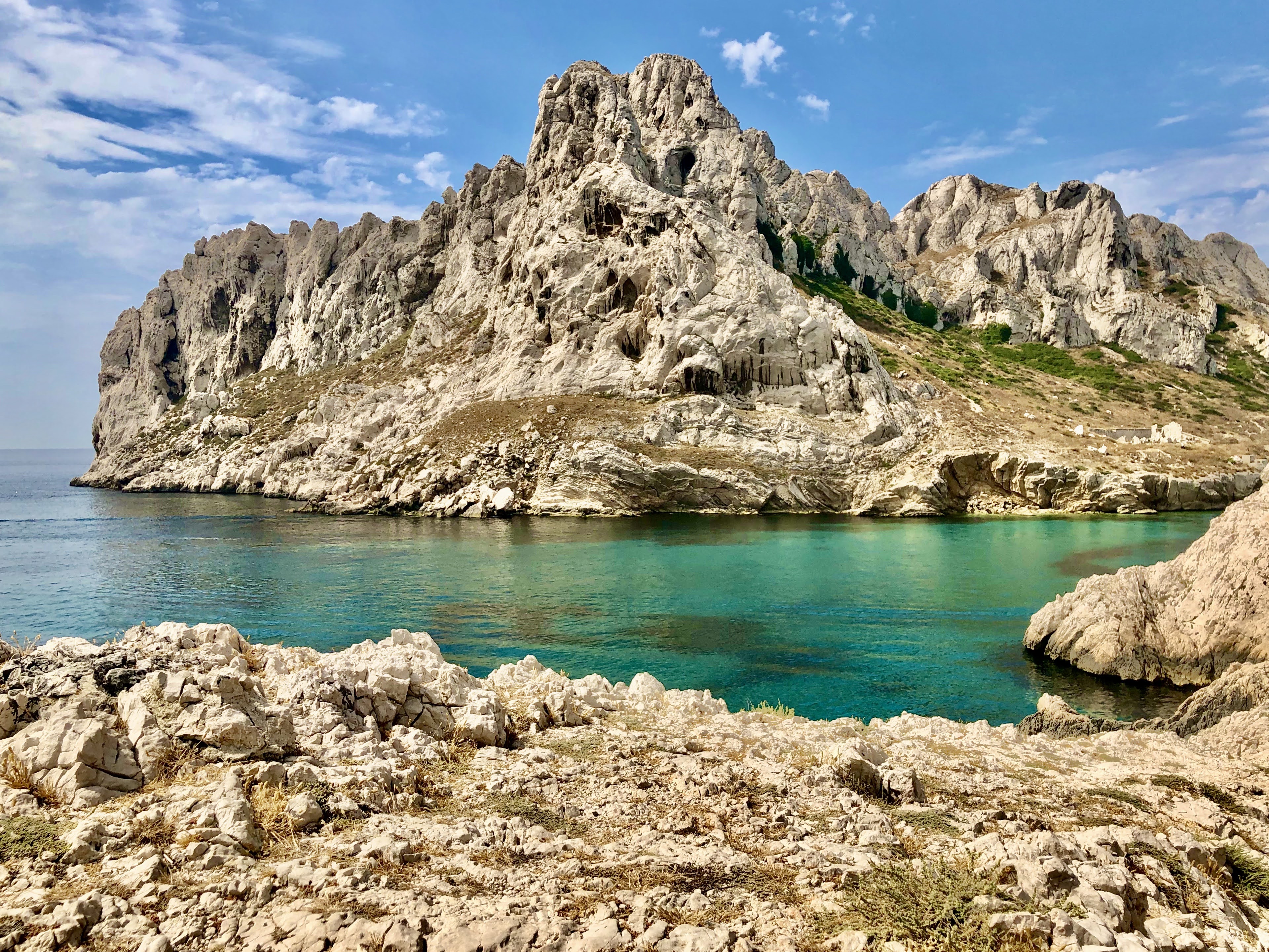 Am mai poovestit pe blog despre acest Masif des Calanques… Este vorba despre niște faleze vertiginoase, de un alb strălucitor, tăiate de crestături adânci și înguste și care, pe o lungime de aproximativ 20 km între Marsilia și Cassis, se scufundă în apele de un albastru profund ale Mediteranei. Ar putea fi ușor comparate cu fiordurile, doar că se scaldă în ape mai calde, sau cu niste golfuri mai strâmte. Calanque este de fapt o formațiune geologică specific mediteraneană, o vale litorală foarte abruptă, săpată în rocă de calcar de un curs de apă. Văile s-au format prin eroziune, iar ulterior partea lor inferioară și cavitățile subterane au fost inundate de mare, care a și modelat în anii ce-au urmat, împreună cu vântul, relieful pe care-l putem vedea astăzi.
