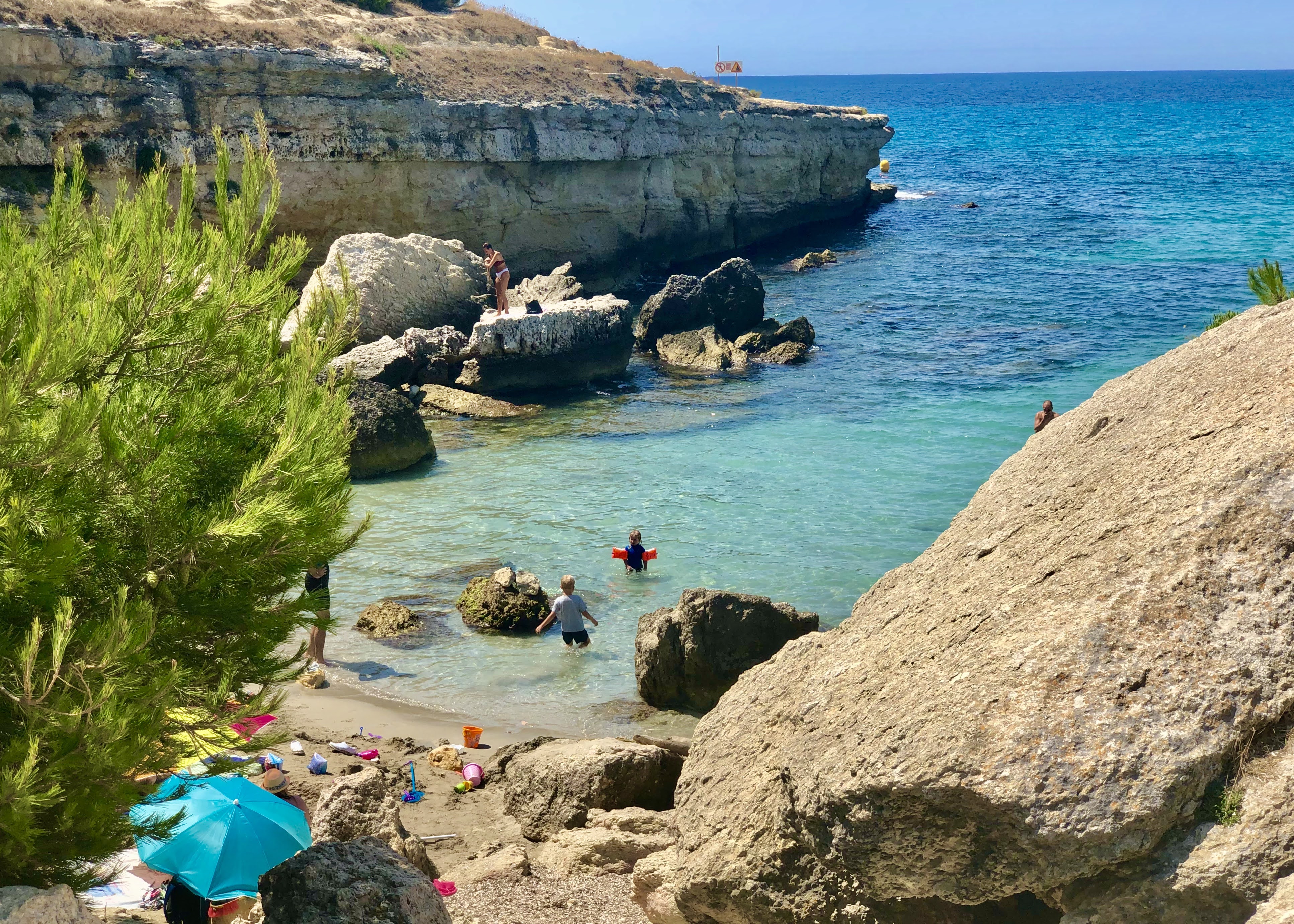 Coasta Albastră este și o destinație foarte child friendly, ca să zic așa, o destinație numai bună de mers cu copiii. Campingurile și plajele din zonă sunt foarte frecventate de familiile cu copii, nisipul este fin, golfulețele ferite de valuri mari, intrarea în apă foarte lină. Zona nu este aglomerată, copii putând astfel să se bucure de natură. Pentru că, personal, ceea ce vreau să le transmit fetelor mele despre mersul la mare este fix despre frumusețea aceea primordială a mării, despre autenticitatea ei, despre plăcerea a fi în mijlocul naturii, de a te întinde pe nisipul cald, de a te bucura de zgomotul valurilor, de a respira aerul sărat, de a profita de o baie relaxantă, ori a privi în liniște un apus de soare pe faleză și nicidecum despre vacanțe în resorturi all-inclusive, piscine și parcuri acvatice gălăgioase, aglomerație, sau fițe de doi bani.