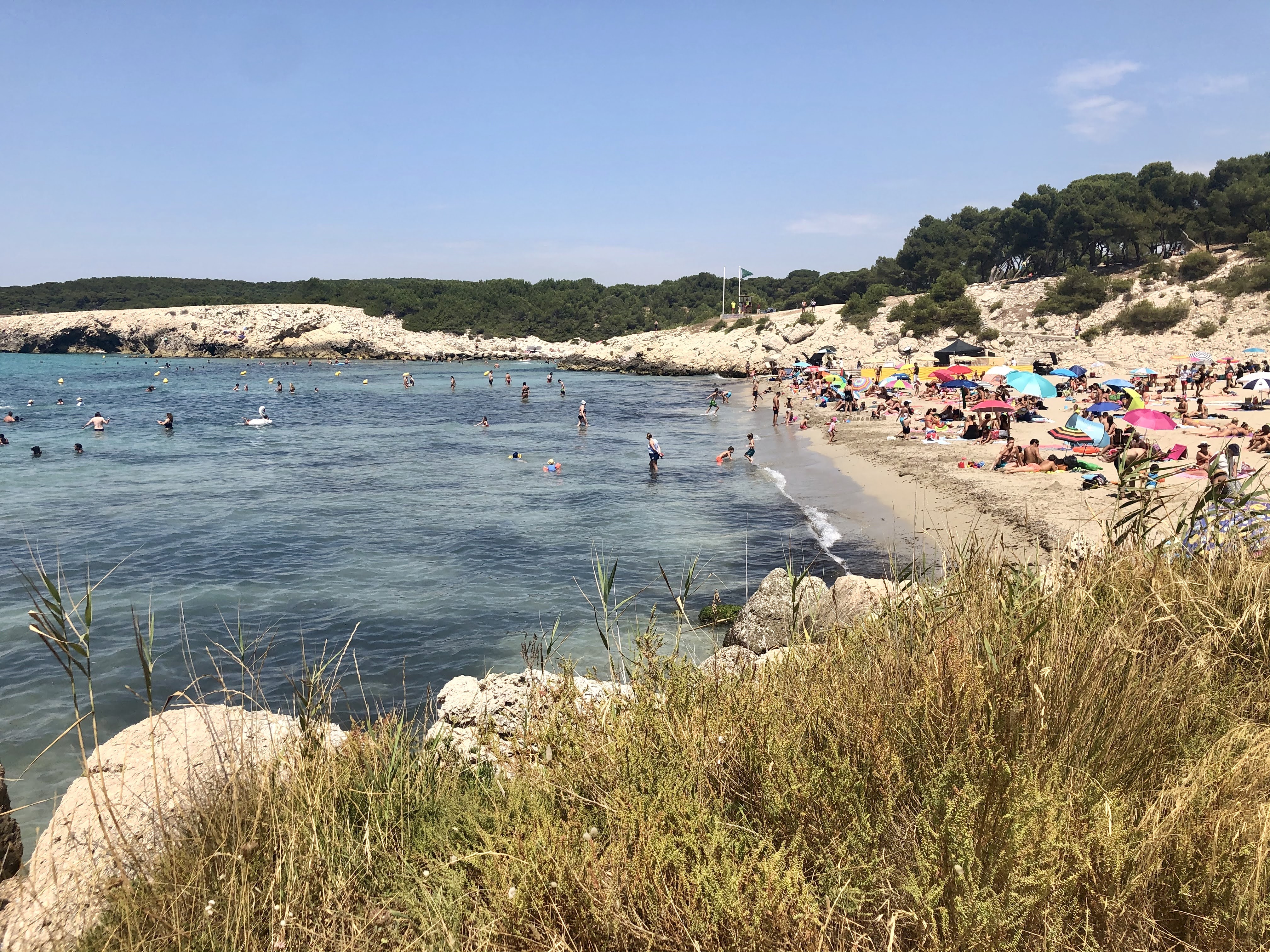 În primul rând te poți bucura de mare. Litoralul Coastei Albastre este superb, plajele mari cu nisip fin și micile golfulețe înguste și sălbatice succedându-se cât se poate de armonios. Căci în primul rând despre ele sunt vacanțele la mare nu-i așa? Despre ape limpezi, cer senin și nisip fin. Noi mergem adesea pe plaja Sainte-Croix, o plajă cu nisip destul de largă, mărginită de pereți stâncoși și înconjurată de o pădurice de pini. Emblema ei este o mică capela așezată pe un pinten stâncos. Intrarea în apă se face destul de lin, fiind o plajă preferate de familiile cu copii. Alături de plaja vecină, Saulce, deservește practic turiștii din capingurile de la Couronne dar și ați doritori, chiar și localnici din zonă. Sus este o parcare (foarte încăpătoare, cu plată, dar dacă ești cazat în zonă poți veni pe jos, așa cum facem și noi de altfel), un restaurant, un chioșc de sadvisuri, sucuri și înghețată și chiar un mic magazin cu de toate. Și nu, nu există șezlonguri de închiriat, nici bar de cocteiluri de sorbit pe plajă și nici muzică nu urlă pe nicăieri în difuzoare. Mai sunt și alte plaje în zonă: plage du Verdon, între La Couronne și Carro, cea mai mare din zonă. Plaje mari cu nisip mai sunt la Martigues (Bonnieu, Laurons), la Sausset-les-Pins, la Carry-le-Rouet sau la Ensuès-la-Redonne.