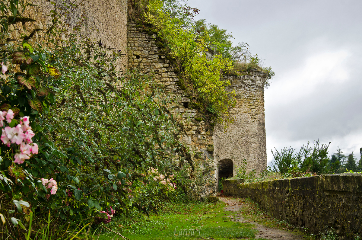 Noi am început vizita cu grădina din jurul castelului. Nu este una tematică, dar este deosebită în felul ei, în special datoria aleilor ce înconjoară vechiul zid medieval, de unde se poate admira o frumoasă priveliște asupra satului și a împrejurimilor. Parcul din interior, amenajat în stilul secolului XIX, oferă vizitatorilor un parcurs idilic, romantic, printre flori, copaci, arbori exotici și statui impunătoare. Mi-au plăcut foarte tare scaunele și mesele din fier! Îmi place în general mobilierul de grădină din fier, dar parcă acesta, așezat lângă trandafiri urcători și ziduri de sute de ani, părea mai special. Însă ce m-a uns la suflet a fost plimbarea pe lângă zid. La punctul cel mai înalt al traseului, unde am oprit pentru o ședință foto, era chiar o băncuță. Vă jur că n-aș mai fi plecat de acolo, atât de frumos se vedea totul în jur!