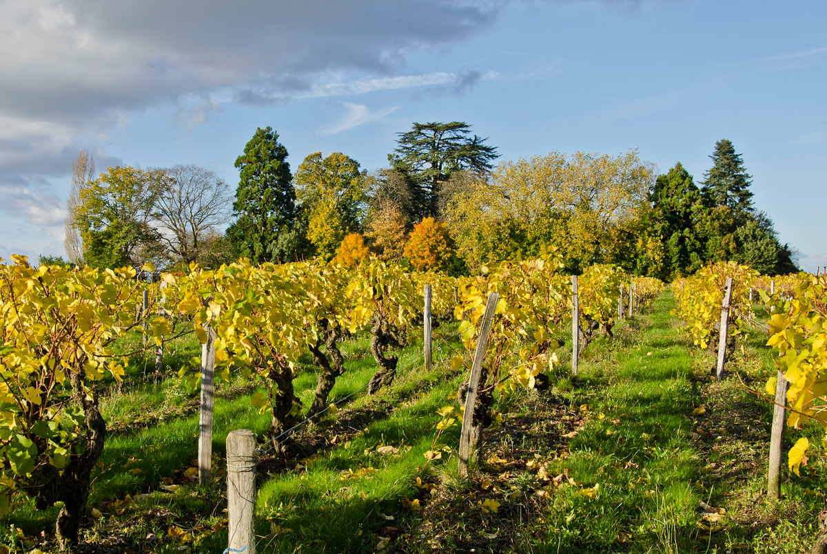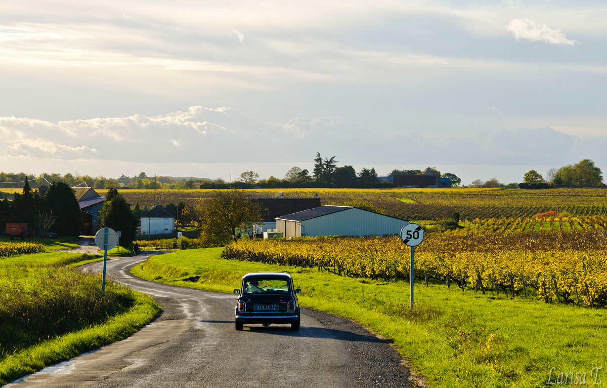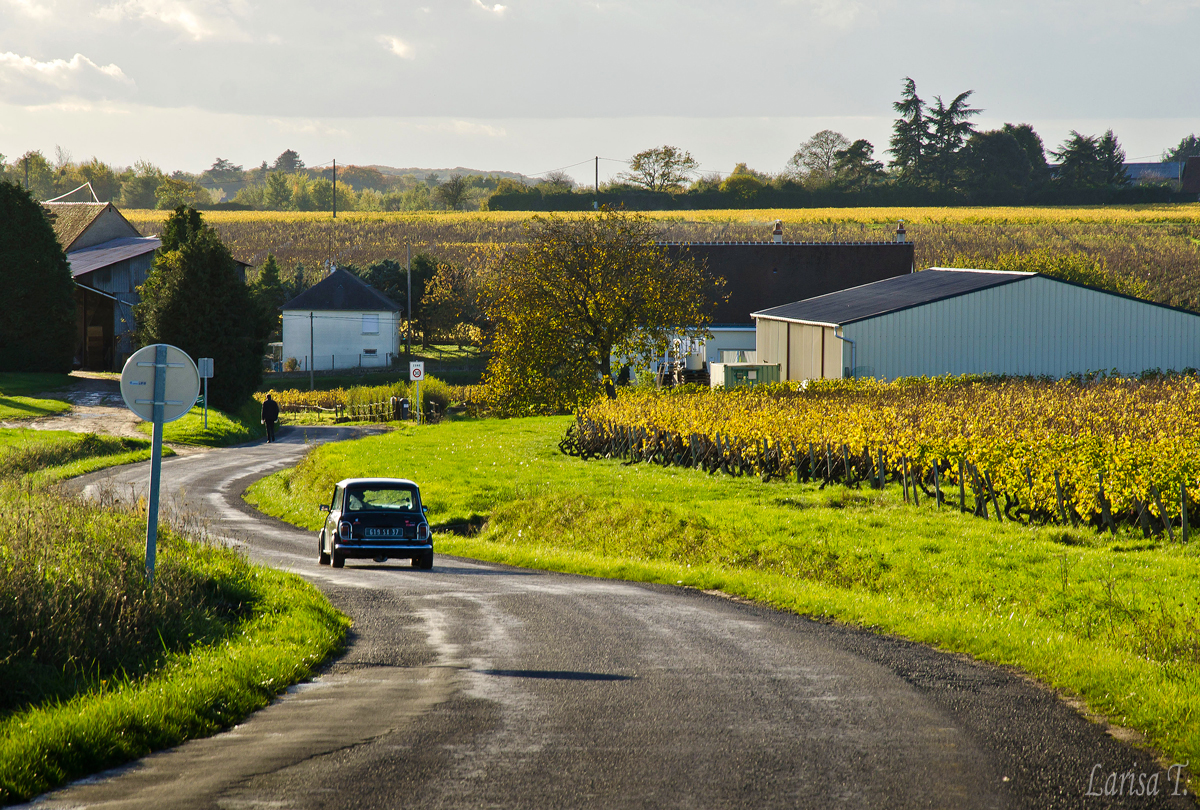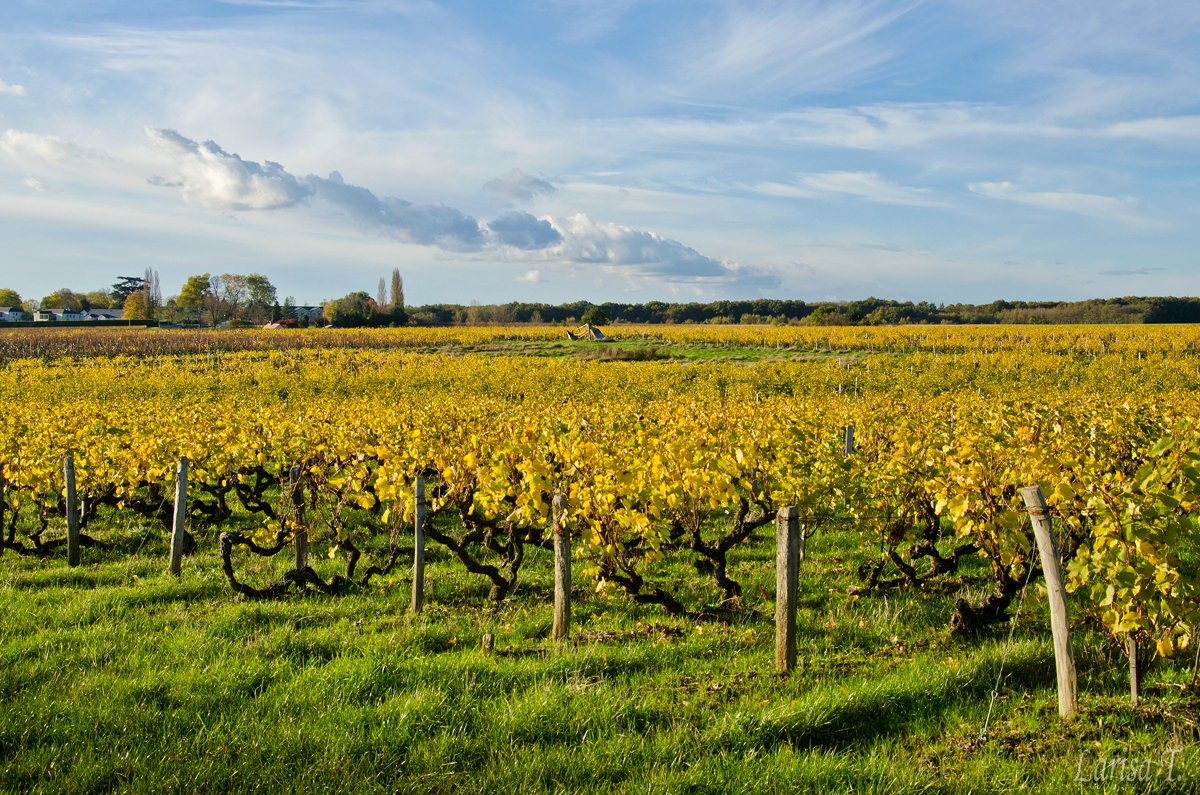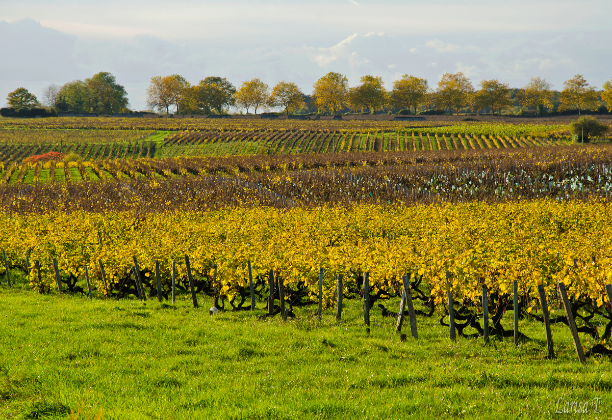 Iar dacă pentru primele este deja celebră, locuind aici, eu am început s-o îndrăgesc și pentru vii și nu mă refer aici doar la produsul lor final. E surprinzător, pentru că nu demult, pe vremea când eram în țară, o plimbare prin vie nu mi-ar fi sunat prea tentantă, însă aici, în lipsă de munți, drumețiile pe podgorii au devenit interesante pe măsură ce au devenit din ce în ce mai dese, iar eu am început să înțeleg mai mult și mai profund care-i treaba cu „facerea” vinului. Cum ador în general plimbările în natură, am descoperit și cât de diferit este peisajul în vie în funcție de anotimp. În plus, viile sunt atât de îngrijite, curate și dichisite, că, pasionat sau nu, ți-e mai mare dragul să mergi prin ele și să-ți clătești ochii. De când am venit în Franța, am învățat fără să vreau mult mai multe despre vie decât știam în România, mai mult decât credeam că voi ști vreodată, însă ce n-am aflat eu până duminică, este ce spectacol de culoare de un galben inedit îți poate oferi o podgorie la sfârșit de toamnă.