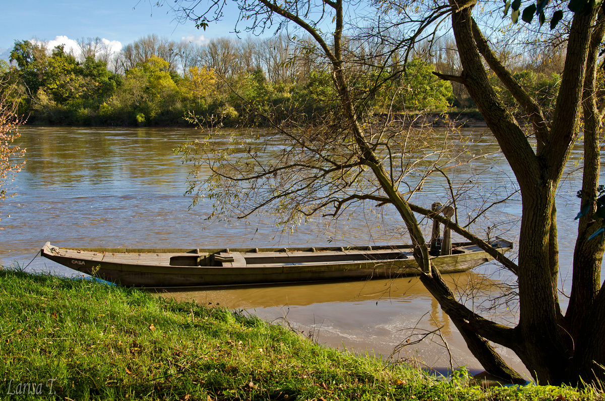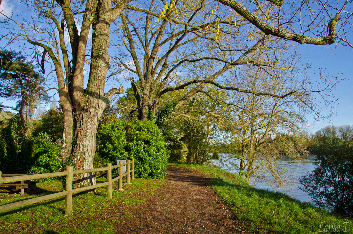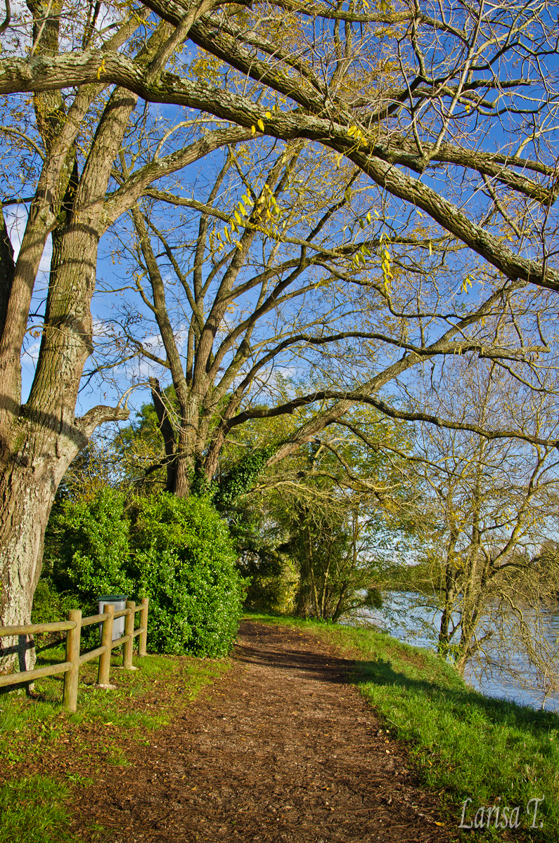 Am oprit mașina pentru început în centru, în parcarea din fața Oficiului de Turism (pentru că până și satul ăsta total nesemnificativ are unul!) și am luat-o la pas spre cărarea amenajată pentru promenadă. Însă înainte de asta, interesantă mi s-a părut clădirea oficiului, construită ingenios, chiar pe malul Loarei, cu un fel de turn înalt, în care urci pe niște scări în spirală, iar de sus poți admira o panoramă deosebită: Rochecorbon pe de o parte, în toată splendoarea lui și Loara pe de alta. Cum am mai scris, nu încetez să mă mir de felul în care oamenii ăștia fac turism din ORICE. Am urcat și eu, am tras 2 poze, am coborât, că Azorel are rău de scări și am luat-o la pas pe malul apei. N-am mers mult, doar un pic cât să luăm o gură de aer în mijlocul naturii și cât Azorel să poată alerga liber, fără lesă. Pe malul Loarei iarba este încă verde și va continua să fie și la iarnă, în timp ce majoritatea copacilor sunt cheliți bine. E ciudat contrastul, dar totodată interesant…