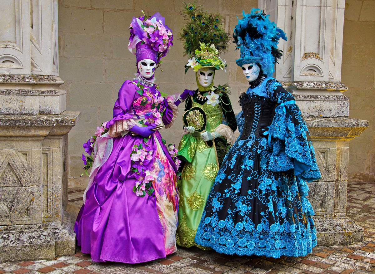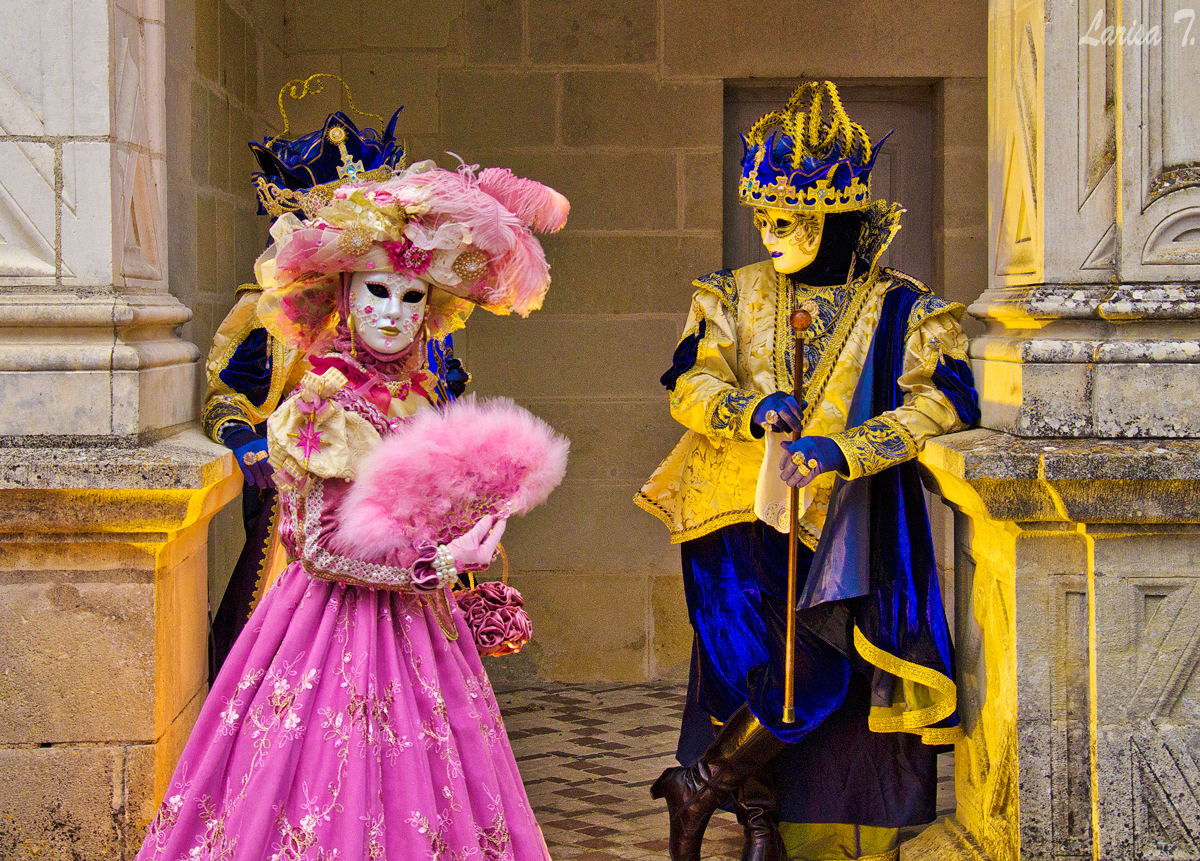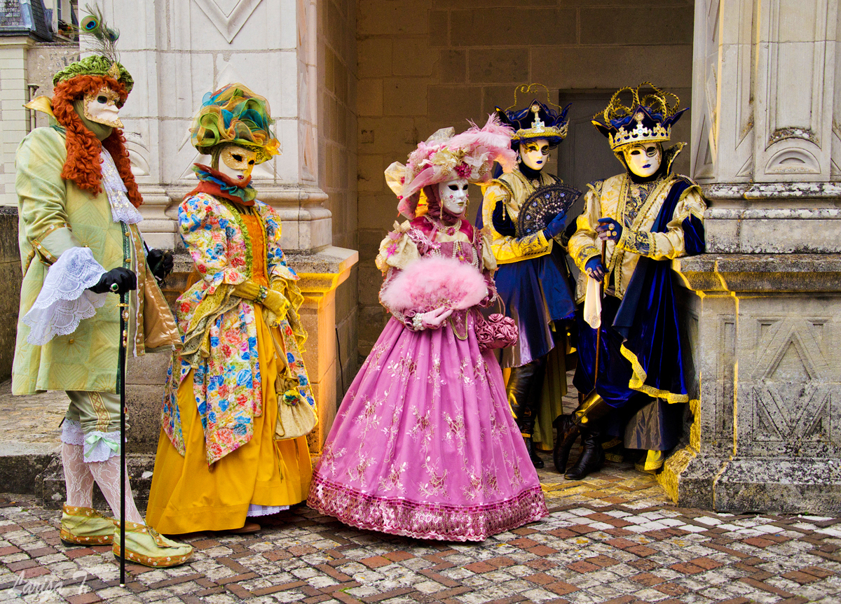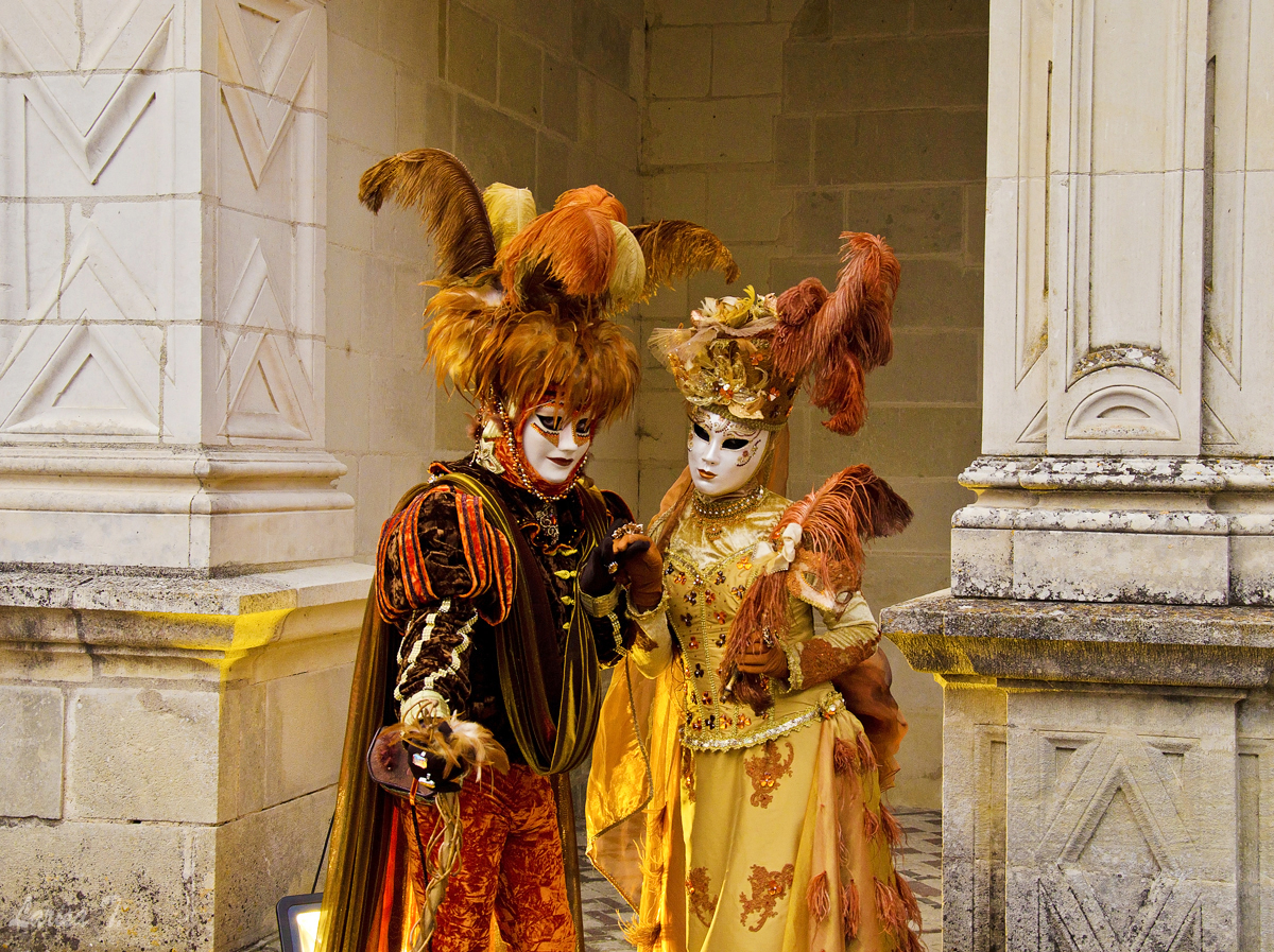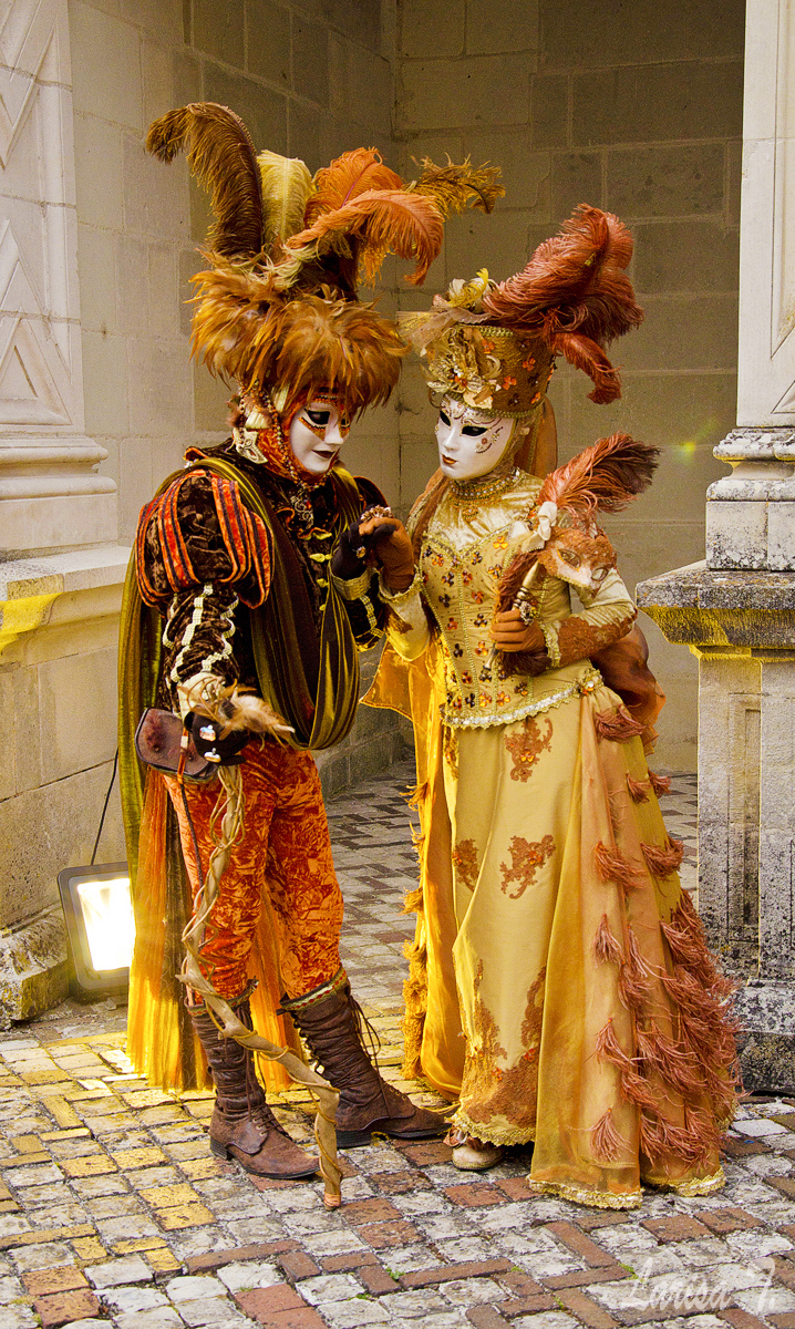 Două personaje astfel degizate ne-au urat bun venit cu o reverență la intrare, iar în momentul în care am pătruns în curte nici nu mai știam unde să mă uit mai întâi. Dintr-o anexă a castelului ieșeau necontentit persoane costumate care mai de care mai uimitor. Absolut toți vizitatorii se înghesuiau cu aparatele, iar costumele se așezau frumos la fotografiat. Toată lumea era fascinată de frumusețea lor, de culori, de modele, de măști, inclusiv eu. Le-am admirat de multe ori în poze pe internet, la Carnavalul de la Veneția, dar până să le văd pe viu, zău că nu mi-am imaginat cât de minunate sunt.