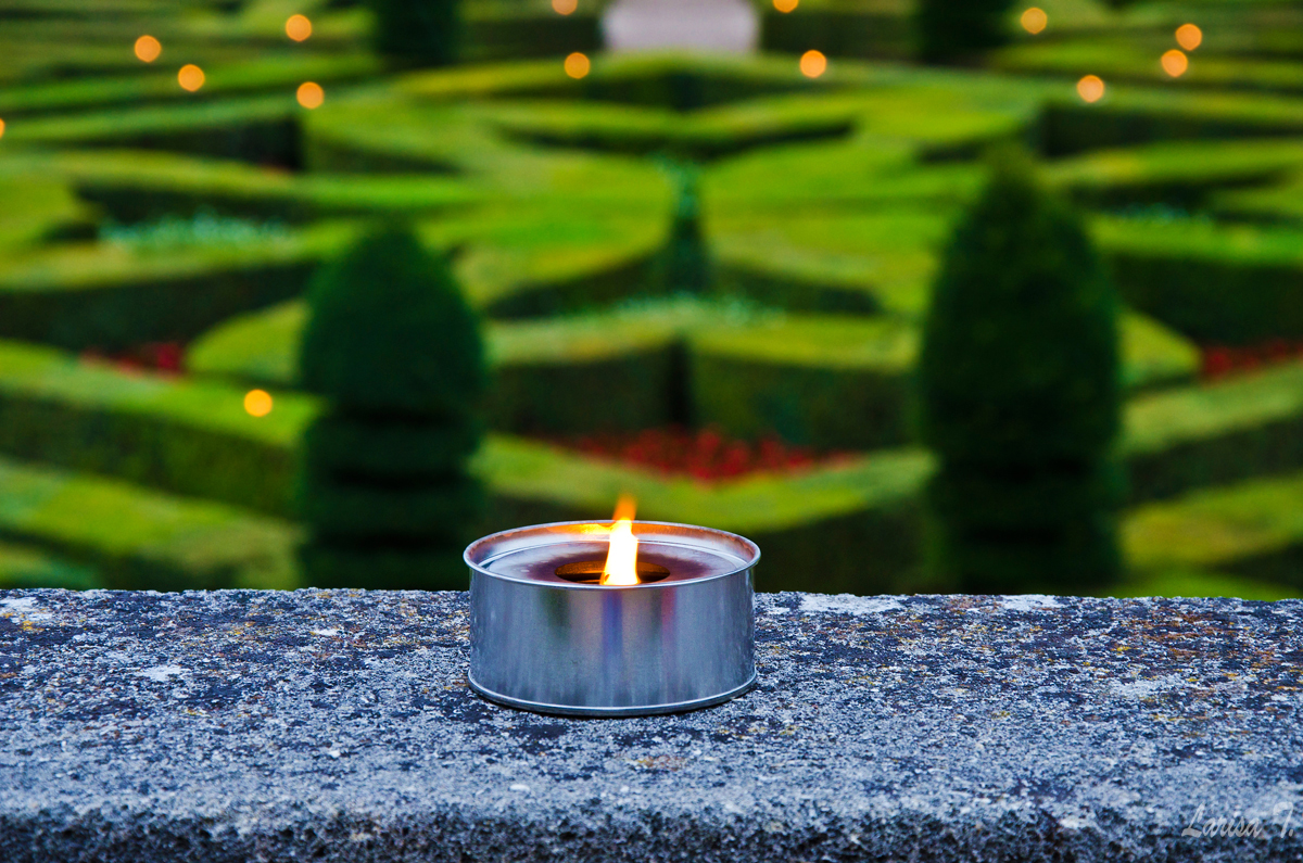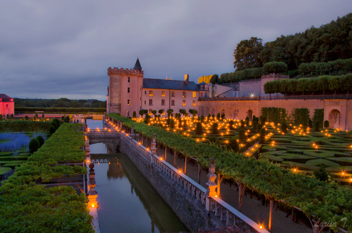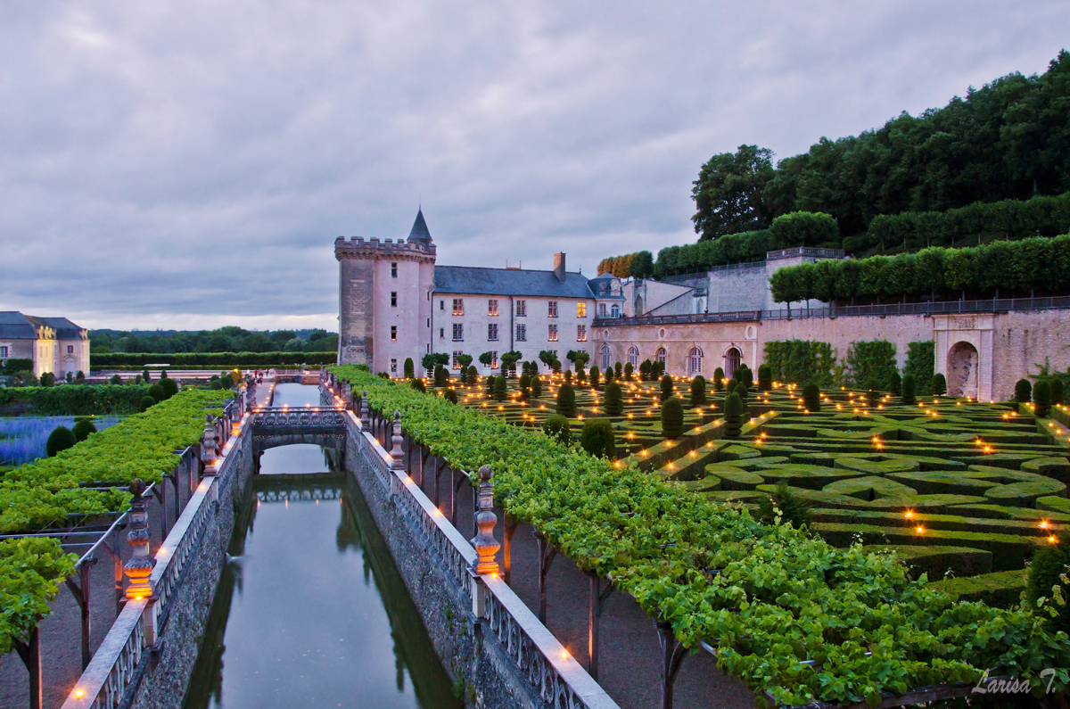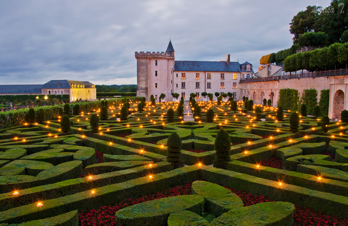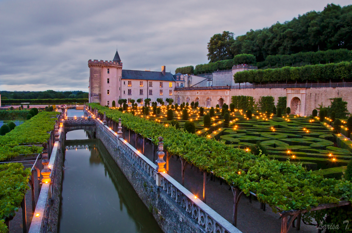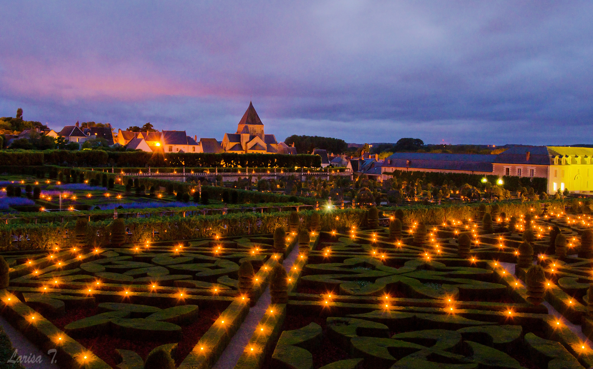 După ce am terminat cu costumele am pornit la o plimbare prin grădini. Deși noaptea nu se lăsase încă, lumânările erau deja aprinse. Am luat-o la pas prin Le Potager- Grădina de Zarzavaturi, cea cu 9 pătrate cu dimensiuni identice, dar cu motive geometrice diferite în interior, am urcat mai apoi în al doilea Salon al Grădinii Ornamentale, unde lavanda îți muta nasul din loc cu parfumul ei, ca mai apoi să ajungem și mai sus, pe terasă desupra canalului cu apă și să admirăm primul Salon al Grădinii Ornamentale în toată splendoarea sa, cel despre care se spune că ar constitui o prelungire a camerelor castelului. Aici, în acest prim salon, erau așezate intenționat probabil cele mai multe lumânări, deși grădina acesta arată într-un mare fel și fără. A fost a patra oară când am admirat grădinile de la Villandry, și cred că nu m-aș plictisi niciodată să revin, peisajul și culorile schimbându-se de la lună la lună și de la an la an.