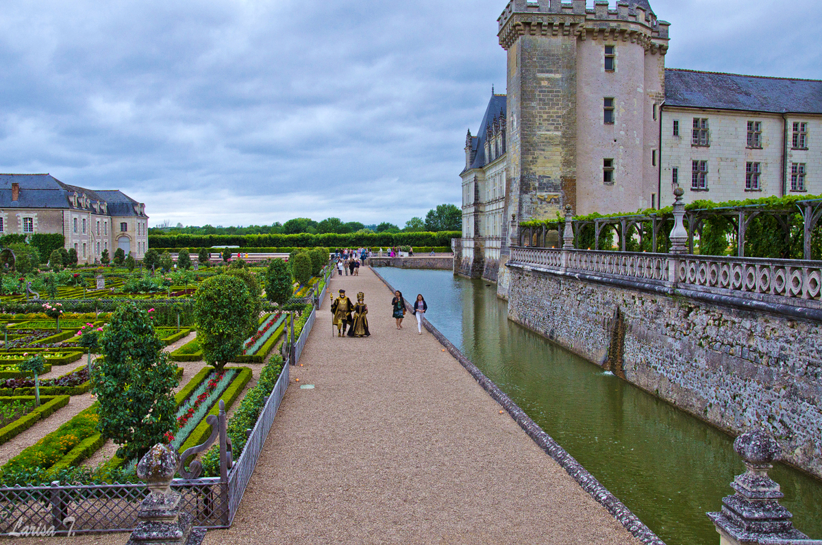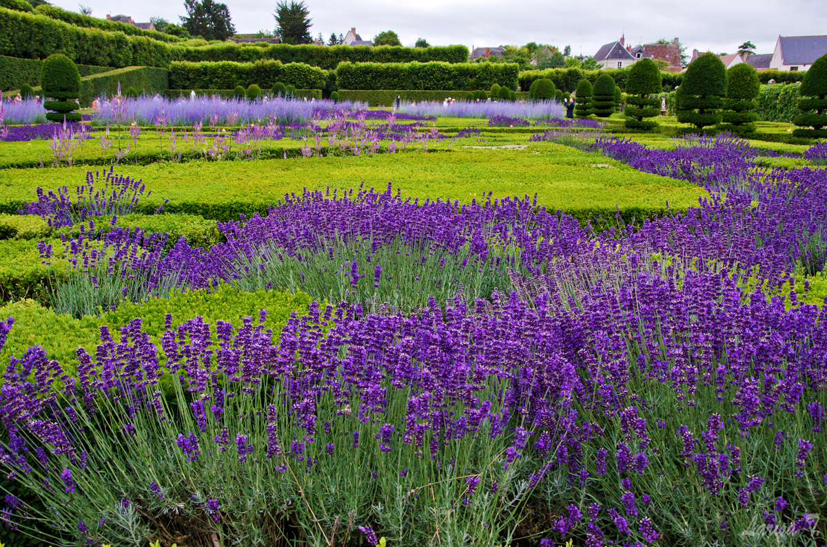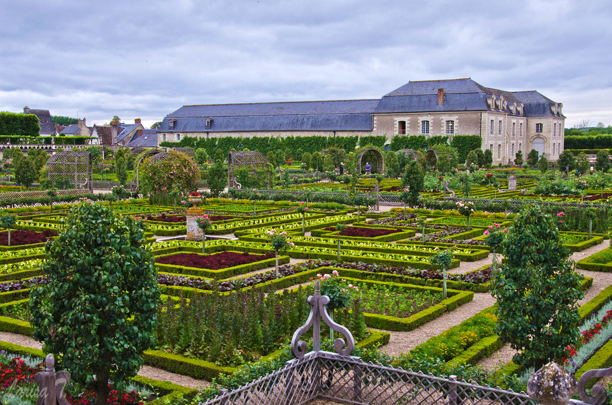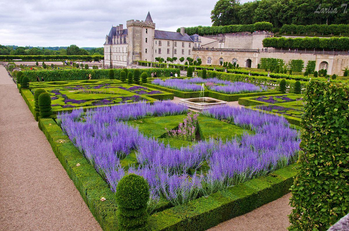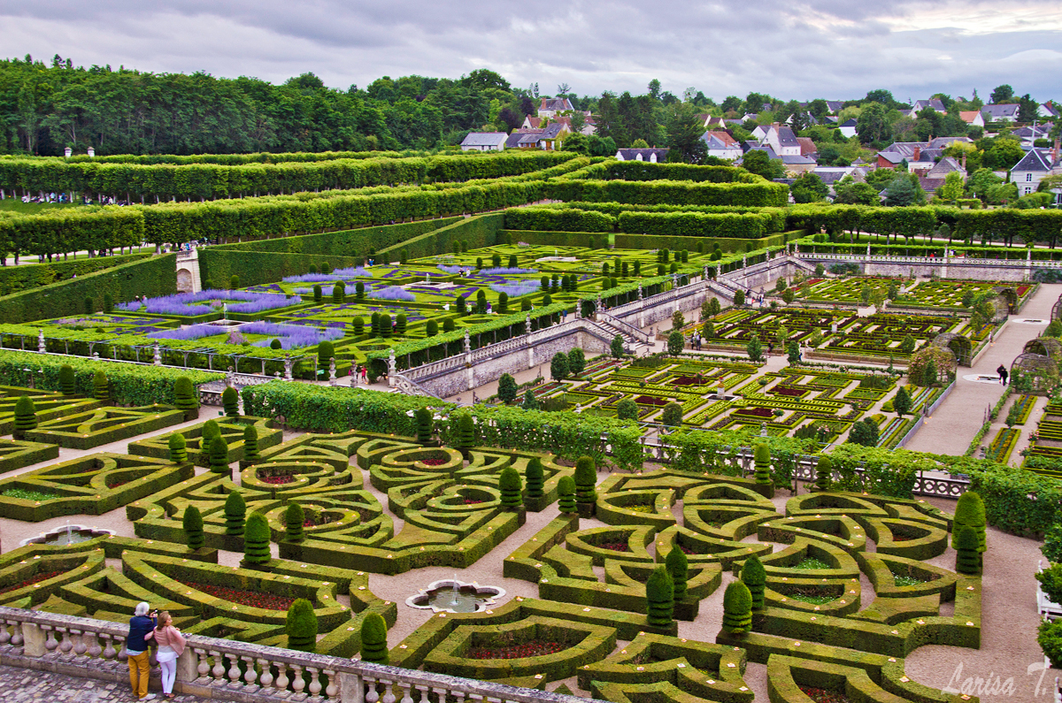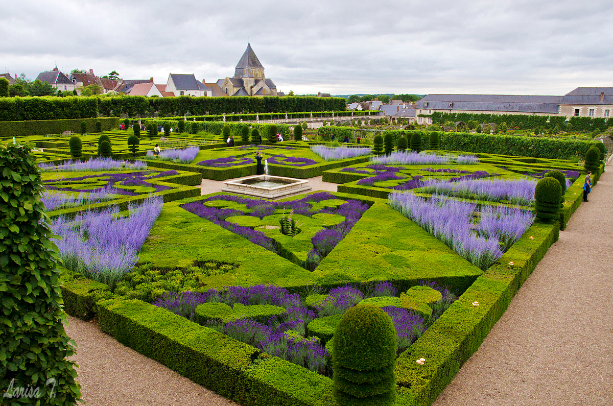 După ce am terminat cu costumele am pornit la o plimbare prin grădini. Deși noaptea nu se lăsase încă, lumânările erau deja aprinse. Am luat-o la pas prin Le Potager- Grădina de Zarzavaturi, cea cu 9 pătrate cu dimensiuni identice, dar cu motive geometrice diferite în interior, am urcat mai apoi în al doilea Salon al Grădinii Ornamentale, unde lavanda îți muta nasul din loc cu parfumul ei, ca mai apoi să ajungem și mai sus, pe terasă desupra canalului cu apă și să admirăm primul Salon al Grădinii Ornamentale în toată splendoarea sa, cel despre care se spune că ar constitui o prelungire a camerelor castelului. Aici, în acest prim salon, erau așezate intenționat probabil cele mai multe lumânări, deși grădina acesta arată într-un mare fel și fără. A fost a patra oară când am admirat grădinile de la Villandry, și cred că nu m-aș plictisi niciodată să revin, peisajul și culorile schimbându-se de la lună la lună și de la an la an.