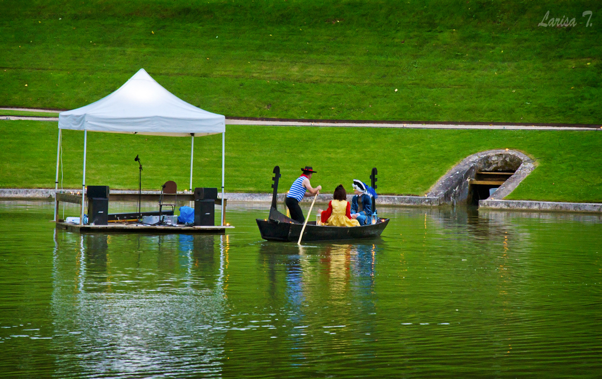 După plimbare ne-am așezat ca toată lumea pe peluza din Grădina Apei în așteptarea concertului. O mică gondolă cu două personaje venețiene navigau agale, laolaltă cu o pereche de lebede albe. Până la urmă n-am rămas așezați în timpul concertului, ci am preferat să mai dăm o tură prin grădină, mai ales că se lăsase întunericul, iar muzica o puteam auzi și mergând. Dacă vântul n-ar fi suflat cu putere, cerul ar fi fost senin, tempratura un pic mai ridicată și mi-ar fi servit un pahar de vin la intrare, cu siguranță ar fi fost seara perfectă, dar m-am mulțumit și așa, doar cu grădina vibrând feeric pe ritmuri renascentiste.