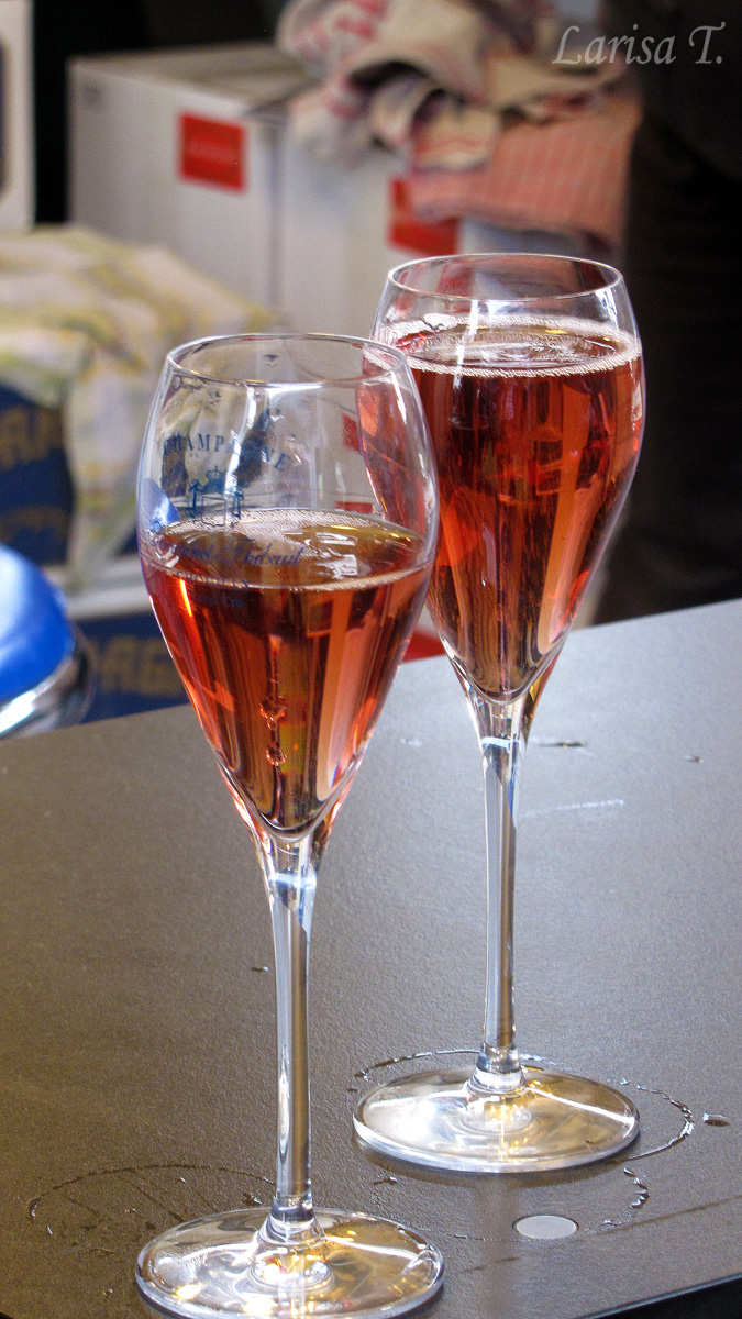 După ce ai studiat oferta, trebuie să te oprești undeva să servești apéro-ul. În Franța apéro-ul este obligatoriu, altfel, v-am mai spus eu, nu-i art de vivre à  la française. Apéro-ul este băutura aperitiv de fapt, însoțită de obicei de ceva de ronțăit, gen cârnați, masiline, ca să nu-l bei chiar sec. Eu încep de obicei cu o cupă de vin spumos, un pétillant adică. Însă în timp ce căutăm pétillantul mi-a sărit în ochi standul cu șampanie. Șampanie din aia adevărată vreau să zic, din Champagne și am zis azi hai să gustăm! Aveam chiar de ales: roșie, rosé sau albă! Rosé, s’il vous plaît!