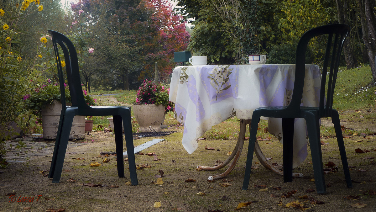 Undeva intr-un astfel de peisaj rupt parca din povesti, se afla casa de vacanta a unor cunostinte, o casuta simpatica, mica, aranjata cu gust, rustica, cu un semineu mare in salon, in care au ars lemne toata noaptea, in timp ce vinul a curs in pahare si friptura a sfarait pe gratar. O noapte ploiasa si rece de octombrie, dar plina de veselie si voie buna. Dimineata ne-a gasit tot acolo, dupa un somn profund intr-un dormitor la mansarda. Ah, cat de bine este sa admiri culorile toamnei cu un croissant proaspat in mana si o cafeluta aburinda pe masuta din gradina, sub un alun batran, langa o poienita cu flori.